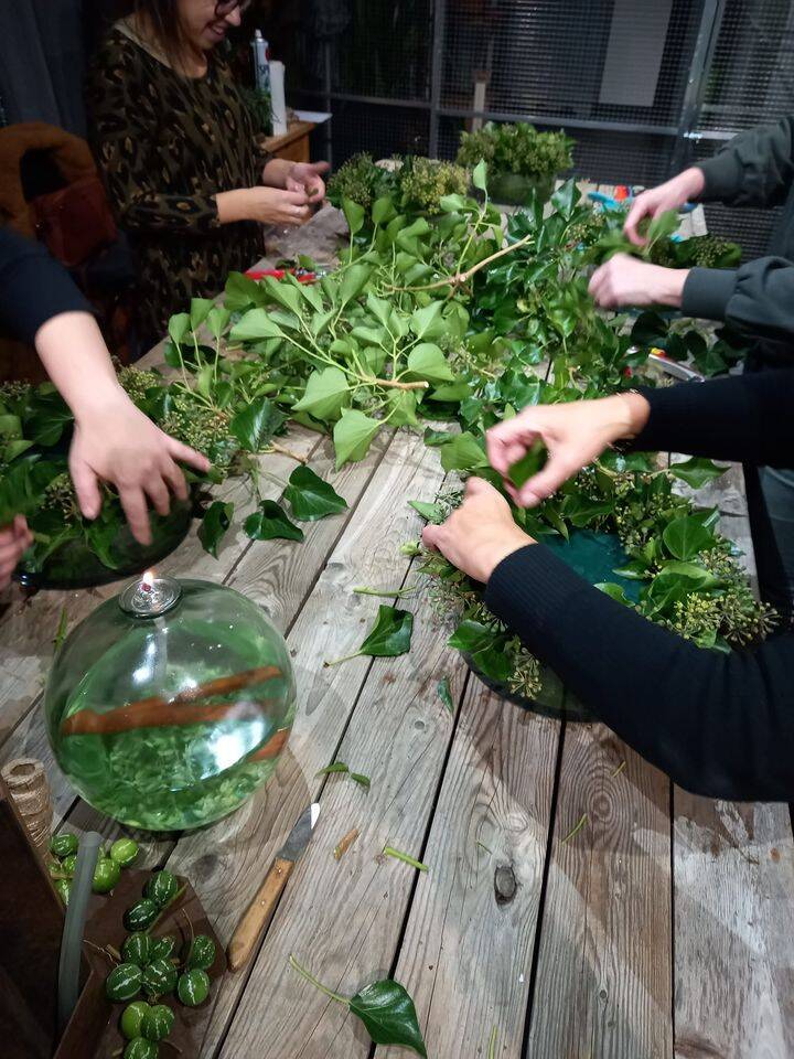 Alles aanwezig om het bloemstuk te maken, alles inbegrepen...ook koekjes en koffie.